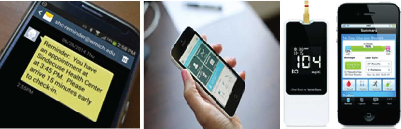 স্মার্ট মোবাইল ফোনের নানাবিধ ব্যবহার যেমন ক্ষুদে বার্তা, শব্দ সংকেত, সাক্ষাতের সময় স্মরণ করানোর কল, নানা ধরনের এ্যাপের ব্যবহার ডায়াবেটিক ব্যবস্থাপনায় কার্যকরী উপকরণ হিসেবে পরিচিতি পেয়েছে। স্মার্টফোনের ব্যবহারিক প্রয়োগের মাঝে আছে ডায়াবেটিক স্বাস্থ্য শিক্ষা, ক্লিনিক ও সাক্ষাতের সময় স্মরণ করানো, ওষুধ সেবন স্মরণ করানো, ইনসুলিন গ্রহণ, নিজে নিজে রক্তের শর্করা পর্যবেক্ষণ, খাদ্যাভ্যাস, ব্যায়াম এবং রোগীদের মাঝে এই রোগ সম্পর্কে সচেতনতা তৈরি।