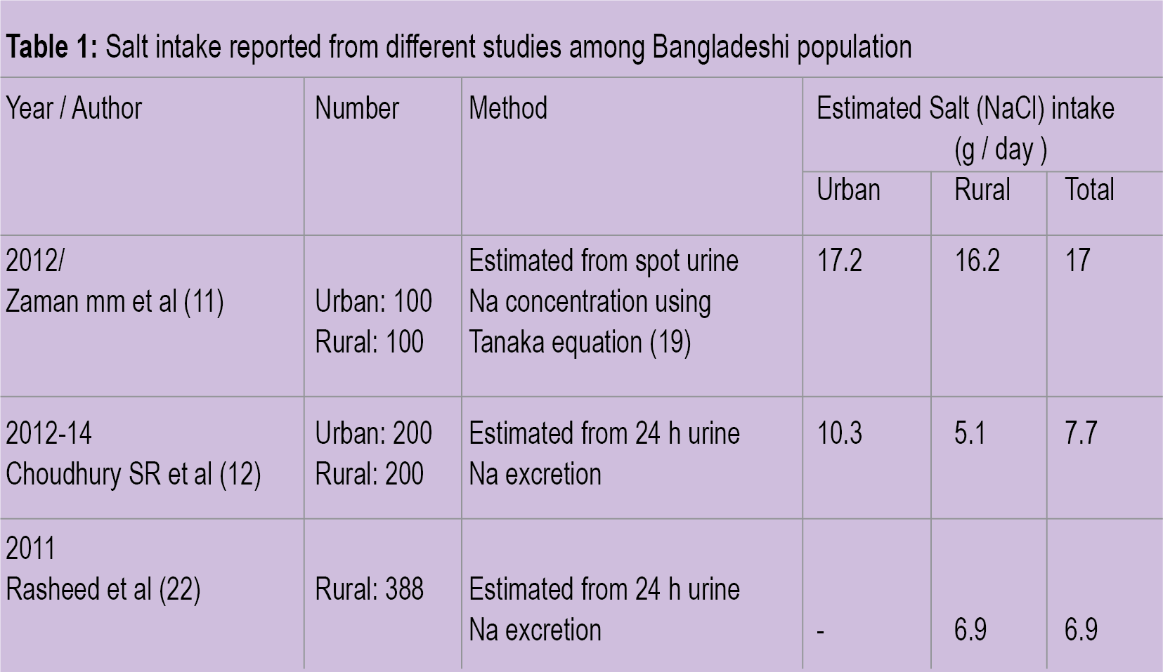 বাংলাদেশে এ সংক্রান্ত তথ্য খুবই কম। প্রস্রাবে সোডিয়ামের মাত্রা থেকে লবণ গ্রহণের মাত্রা পরিমাপের কিছু গবেষণার ফলাফল টেবিল-১-এ দেখুন।