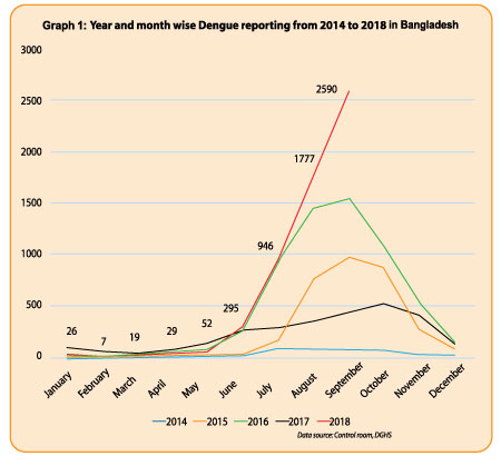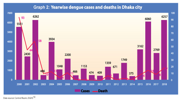 ২০০০ সালে বাংলাদেশ ডেঙ্গু ও ডেঙ্গু হেমোরেজিক জ্বরের বড় রকম প্রাদুর্ভাবে পড়ে, তারপর থেকেই এটি বাংলাদেশে স্থানীয়ভাবে মহামারী আকারে দেখা দিচ্ছে। ২০০০ সালের প্রাদুর্ভাবের সময় ডিইএনভি-৩ এর প্রাধান্যসহ ৪ ধরনের সেরোটাইপের সংক্রমণই লক্ষ্য করা গেছে যা ২০০২ সাল পর্যন্ত স্থায়ী হয়। পরবর্তী বছরগুলোতে অবশ্য ডিইএনভি-১ ও ডিইএনভি-২ এর উপস্থিতিই লক্ষ্য করা গেছে। ডিইএনভি-৩ এর পুনরাবির্ভাব দেখা যায় গত বছর। ২০১৮-তে উল্লেখযোগ্য হারে মৃত্যুর খবর পাওয়া গেছে যা বিগত ১৫ বছরের তুলনায় আশঙ্কাজনক। উপরন্তু আইইডিসিআর-এর অপ্রকাশিত তথ্যমতে এ বছর দুই বা ততোধিক সেরোটাইপের সহসংক্রমণ বিশেষভাবে লক্ষ্য করা যাচ্ছে। ১ম ও ২য় গ্রাফচিত্রে গত কয়েক বছরে ডেঙ্গু আক্রমণের হার এবং মৃত্যুহারের পরিসংখ্যান দেয়া হলো।
