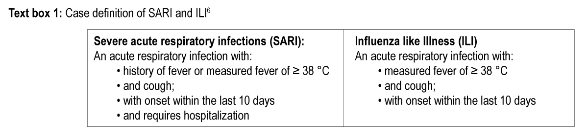 Participants are recruited from the pediatric and medicine departments of the sentinel sites. Two types of cases are recruited: a) Severe Acute Respiratory Infections (SARI); b) Influenza like illness (ILI). ILI cases from out-patient departments and SARI cases from in-patient departments are selected using the case definition presented in Text Box 1. Nasal and throat swabs are collected from each of the enrolled cases and transported to IEDCR and icddr,b laboratories on weekly basis and tested for influenza A & B with reverse transcription polymerase chain reaction (RT-PCR). Weekly laboratory and epidemiological data are submitted to WHO Global Influenza Surveillance and Response System.