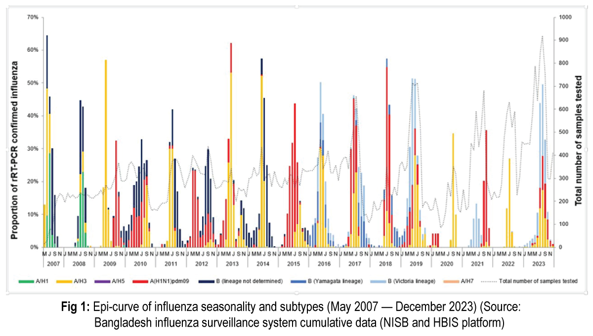 In Bangladesh, the influenza season is from April to September which coincides with the monsoon season. The seasonal peak is in June and July. The number of sample collection increased as the number of sentinel sites increased over time. The frequency of flu strains changed from year to year (Fig 1).