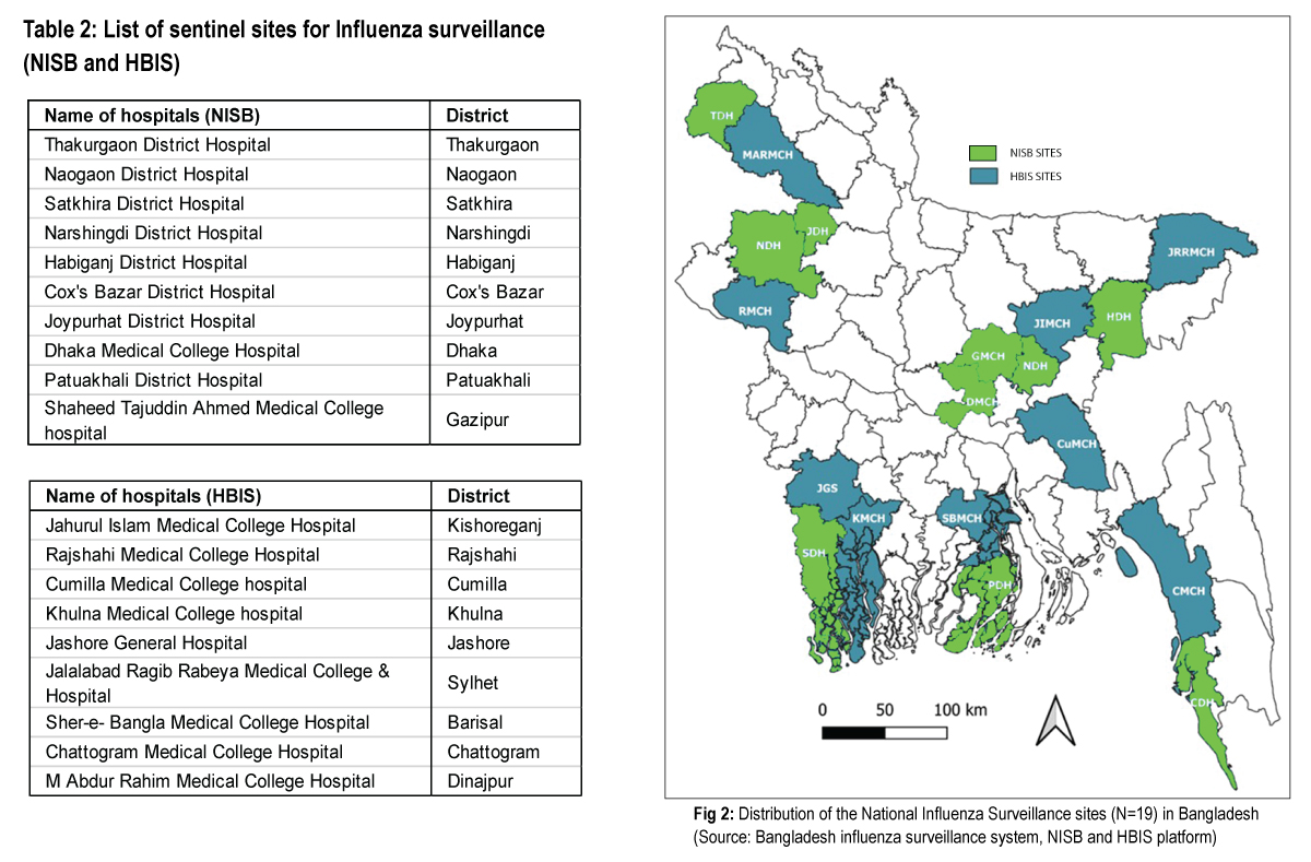 1. NISB (National Influenza Surveillance Bangladesh), coordinated by IEDCR was initiated in 2010, and. It is conducted in 10 sentinel sites across Bangladesh, of which, 8 are district hospitals and 2 are medical college hospitals (Table 2).