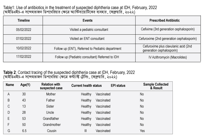 ২০১৮ সাল থেকে সংক্রামক ব্যাধি হাসপাতালে ভর্তি সন্দেহভাজন ডিপথেরিয়ায় আক্রান্ত স্থানীয় রোগীর সংখ্যা এখন পর্যন্ত ১৮ জন। এরকমই একটি সন্দেহভাজন ডিপথেরিয়া রোগী সম্পর্কে অবহিত করা একটি চিঠি সুপারিনটেনডেন্ট, সংক্রামক রোগ হাসপাতাল (আইডিএইচ) দ্বারা ২০২২ সালের ফেব্রুয়ারিতে আইইডিসিআর-এ পরিচালকের কাছে পাঠানো হয়েছিল। একজন মেডিকেল অফিসার এবং একজন মেডিকেল টেকনোলজিস্ট নিয়ে গঠিত একটি দল, কেসটি দ্রুত তদন্ত ও নমুনা সংগ্রহ করার উদ্দেশ্যে পাঠানো হয় কারণ আইইডিসিআর প্রাদুর্ভাব তদন্ত, প্রতিক্রিয়া এবং সংক্রামক রোগ নজরদারির জন্য একটি সরকারী বাধ্যতামূলক প্রতিষ্ঠান। সেই কেসটি এখানে বিস্তারিত আলোচনা করা হলো।