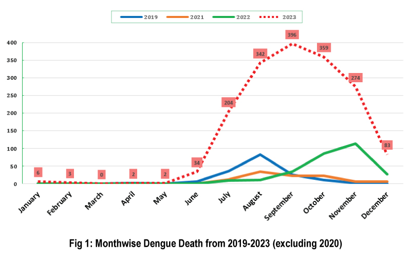 ২০২২ সাল থেকে শুরু হয়ে ২০২৩ সালেও ডেঙ্গু সংক্রমণের মৌসুম পরিবর্তিত হয়ে জুলাই/ আগষ্ট থেকে সেপ্টেম্বর/ অক্টোবর এ হয়েছে। এছাড়াও একটা বড় সংখ্যক রোগী নভেম্বর এবং ডিসেম্বর মাসেও পাওয়া যায়। এর পিছনে নানাবিধ কারণ থাকতে পারে, যার মাঝে বৃষ্টির ধরণ পরিবর্তন ও অপেক্ষাকৃত উষ্ণ তাপমাত্রা অন্যতম (চিত্র—২)।