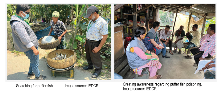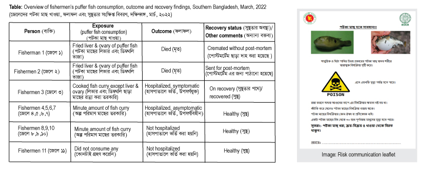 তদন্ত প্রক্রিয়া চলাকালীন, আইইডিসিআর বিভিন্ন স্তরে ক্ষতিগ্রস্ত গ্রামবাসী, গ্রামীণ এলাকা, মাছ বাজার সম্প্রদায়ের মধ্যে পাফার মাছ খাওয়ার সাথে সম্পর্কিত মারাত্মক স্বাস্থ্য ঝুঁকি সম্পর্কে মৌখিক ভাবে আলোচনা করে। আমরা স্থানীয় স্বাস্থ্য কর্তৃপক্ষ, প্রাণিসম্পদ ও মৎস্য বিভাগের ব্যবস্থাপনা এবং প্রতিরোধ সহ এই ধরনের বিষক্রিয়ার মূল দিকগুলি সরবরাহ করার চেষ্টা করেছি। স্থানীয় কর্তৃপক্ষ এবং ক্ষতিগ্রস্ত সম্প্রদায় সহ প্রাসঙ্গিক স্টেকহোল্ডারদের কাছে পাফার মাছের বিষাক্ত বৈশিষ্ট্য সম্পর্কে প্রাসঙ্গিক স্বাস্থ্য বার্তা দেওয়ার প্রয়াসে আমরা ঝুঁকিপূর্ণ যোগাযোগের সরঞ্জাম হিসাবে একটি লিফলেট প্রকাশ করেছি।