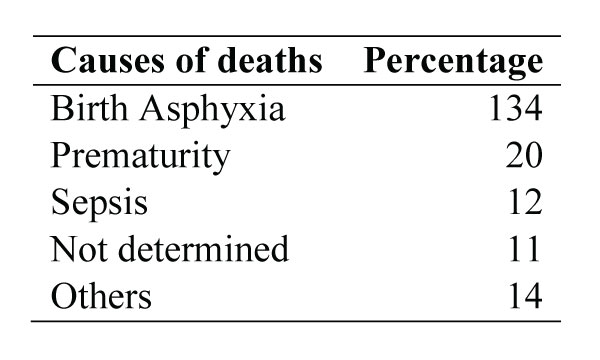 During this period, a total of 191 deaths were investigated. The majority causes of deaths were birth asphyxia (70%, 134/191), prematurity and related complications (10%, 20/191) and sepsis (6.2%, 12/191). For 11 cases, the precise causes could not be identified (Table 8). It may be noted that the number of investigation cases were higher than MITS, as it includes data from the previous MITS also.