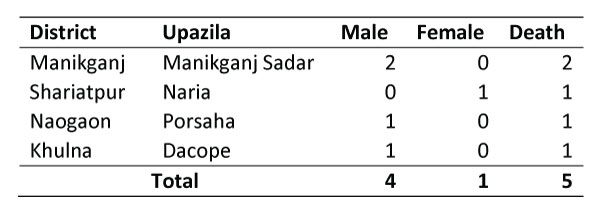 In the 2023-24 session, five cases of NiV infection were detected in 4 districts of Bangladesh. Among them, 4 were males and 1 was a female. All of them had history of raw Date Palm Sap (DPS) consumption. The fatality rate was 100% (Table 3).