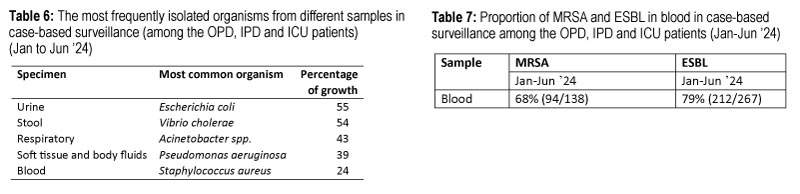The most isolated organisms in different samples were E. Coli in urine, V. Cholerae in stool, Acinetobacter spp. in respiratory, Pseudomonas aeruginosa in soft tissue and body fluids, Staph. aureus in blood (Table 6). The status of MRSA (Methicillin-resistant Staphylococcus aureus) and ESBL (Extended-spectrum beta-lactamase) reflects the situation of AMR. The percentage of MRSA and ESBL were 68 and 79 respectively. This could be explained by the high percentage of patients coming from the ICU (Table 7).