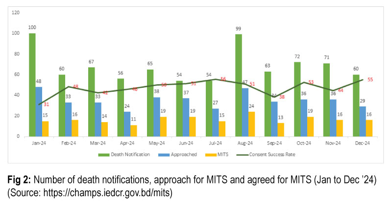 The number of death notifications and approaches for MITS reached their peak in January and August 2024 (Fig 2). The consent success rate has also increased over the year. This increase can be attributed to robust community engagement activities and effective coordination with government and private stakeholders. Between January and December 2024, CHAMP BD team conducted 197 MITS, comprising 110 stillbirths, 64 early neonatal deaths, and the remainder being infants. Of these, 55 cases originated from Baliakandi, Rajbari, while the others were from the six upazilas of Faridpur known as expansion area.