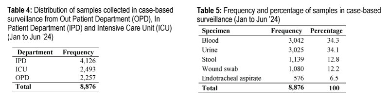 Most number of samples were collected from the IPD (Table 4) of which blood and urine samples comprised the most (Table 5).