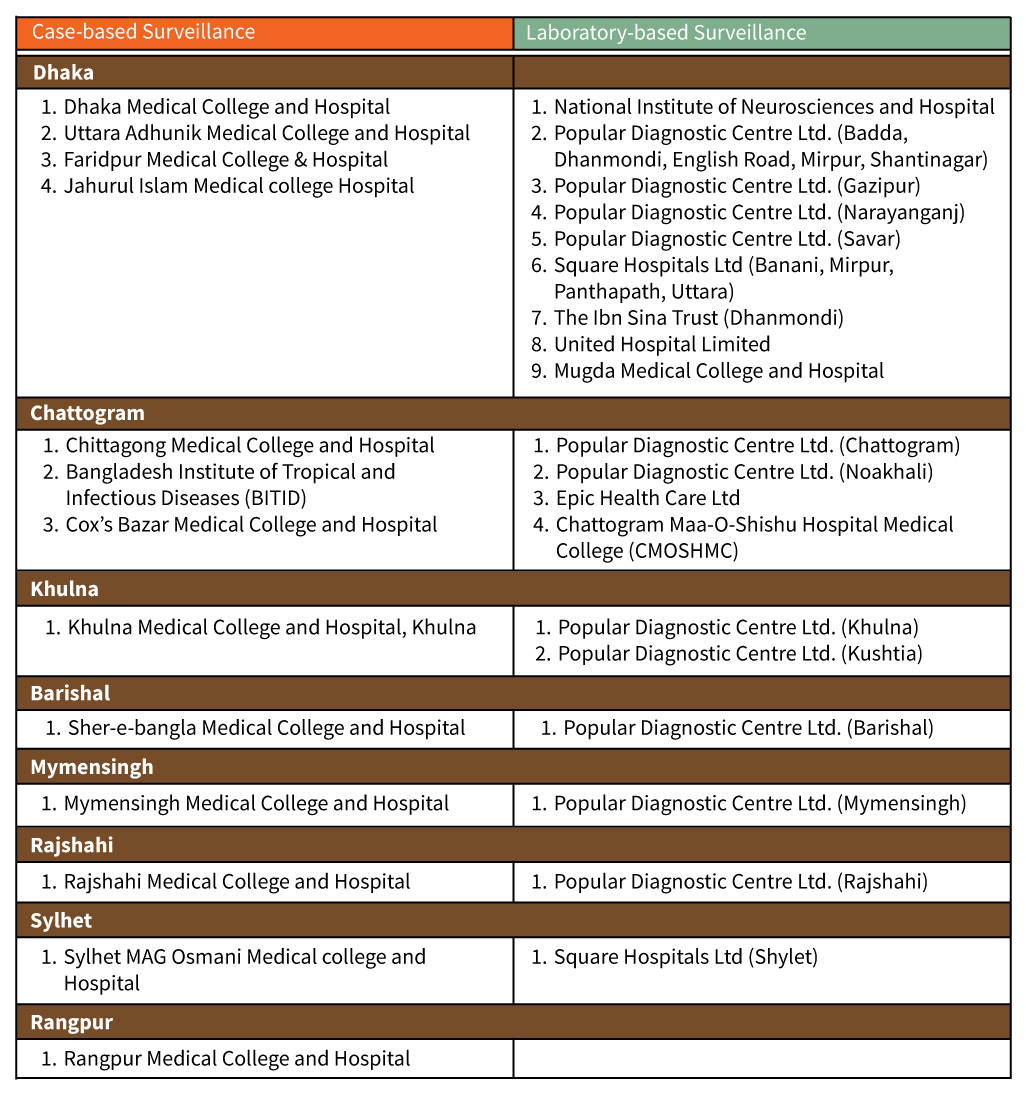 Case-based surveillance: At present, thirteen sentinel sites are functioning, where clinically diagnosed cases are identified, and comprehensive clinical, epidemiological, and microbiological data are collected from patients with suspected infections.